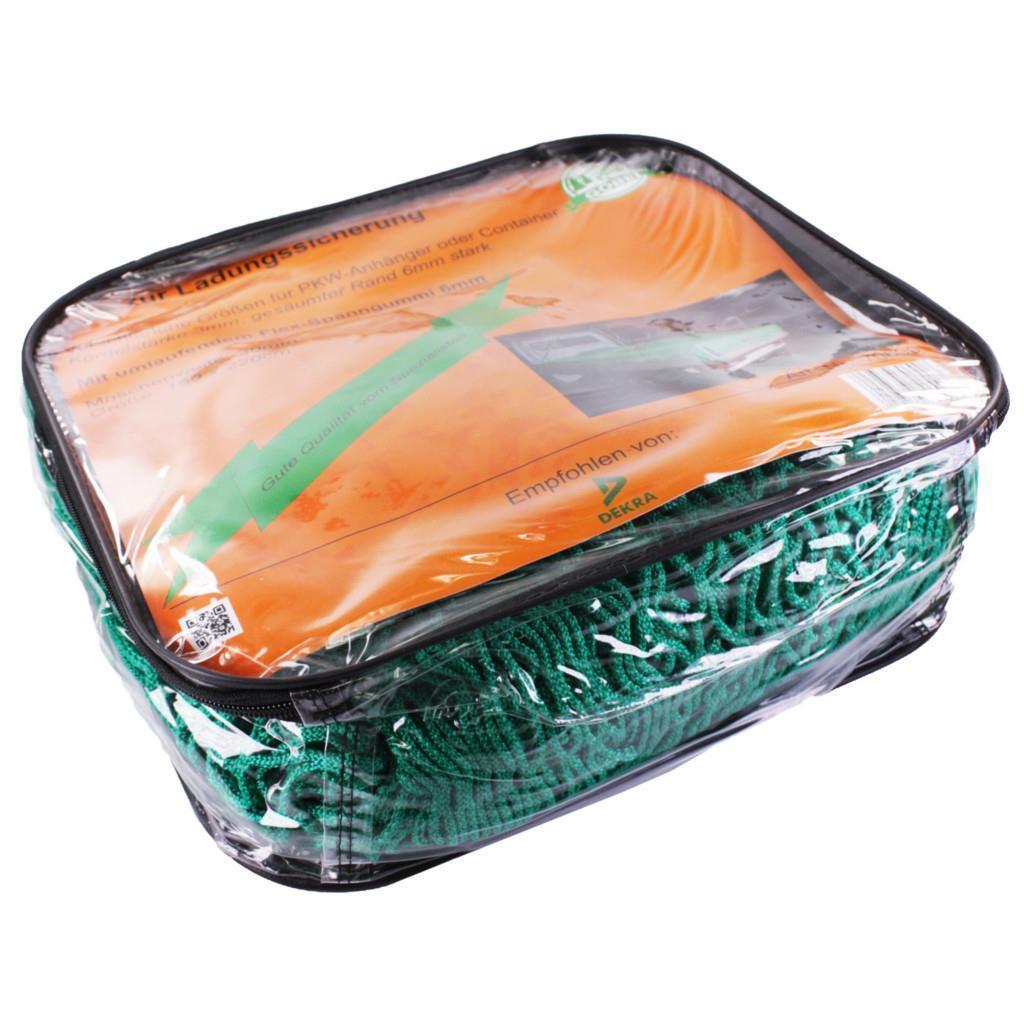 Das Ladungssicherungsnetz »Classic« für Hänger, Pritsche (150x220cm-350x600cm) kann für alle Ladeflächen, PKW-Anhänger und Container genutzt werden. PPNetz hochfest. Kordelstärke 3mm. Gesäumter Rand. Einzeln verpackt. Farbe grün. Sondergrößen auf Anfrage. Mit umlaufendem Flex-Spanngummi 6mm. Maschenweite 30mm.