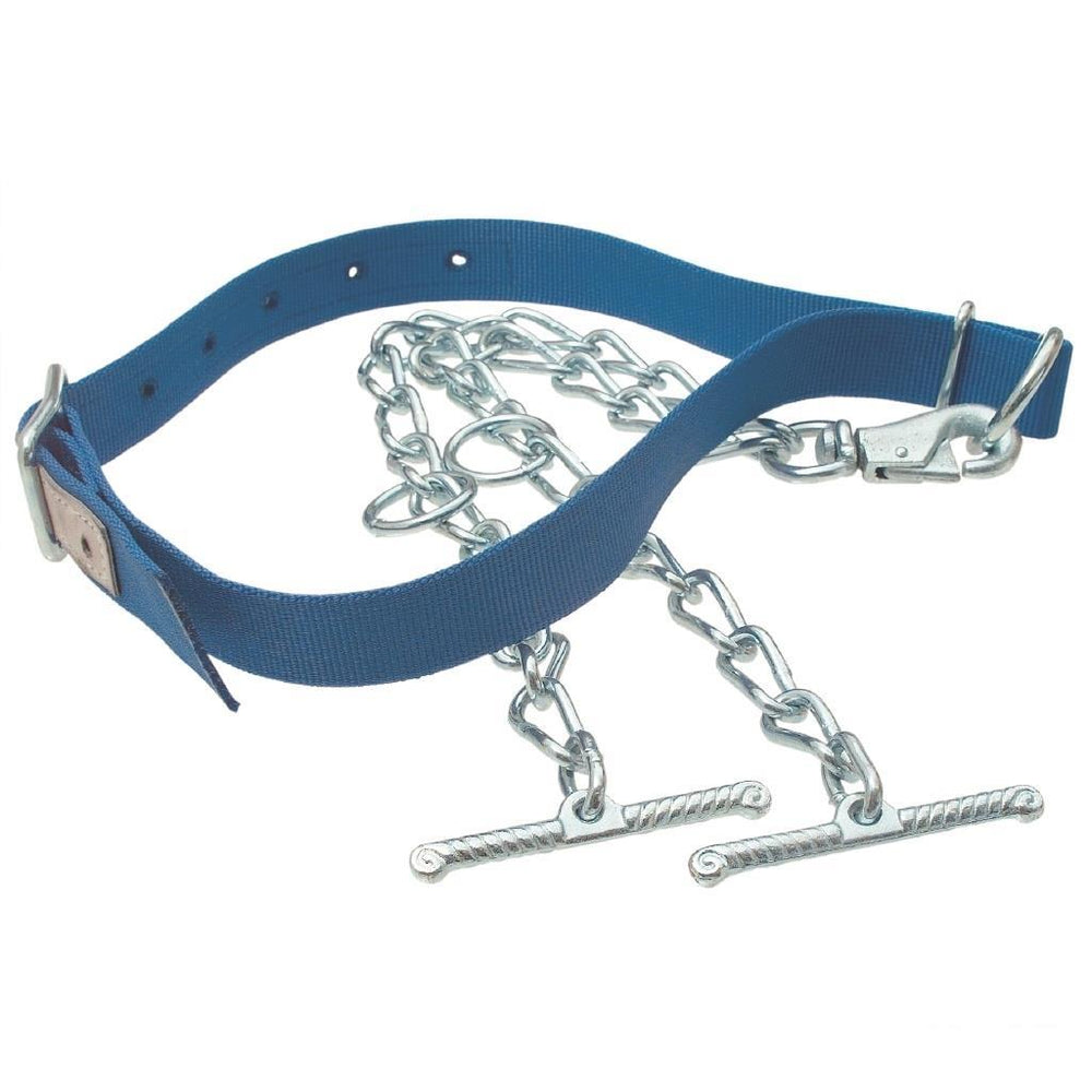 Die Anbindung »Trevira« Halsriemen mit Kettenenden hat Hals- und Boderiemen aus blauem Gurt mit D- Ring und Karabinerhaken. Keine Stromleitfähigkeit, hautschonend, leichtes Öffnen durch Rollschnalle, formbeständiger extra lederverstärkter Halsriemen für Kühe, Rinder und Jungtiere. Mit 2 Kettenenden mit Karabinerhaken und Knebeln, Kette 6mm.