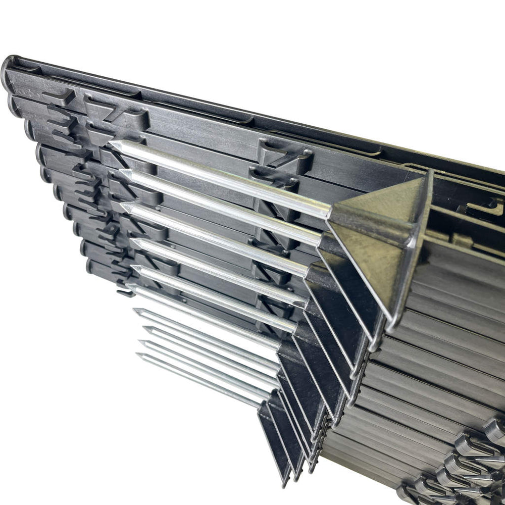 Der aus PP-Copo Kunstoff hergestellte und glasfaserverstärkte Weidezaunpfahl ist UV-stabilisiert und dadurch unempfindlich gegenüber lichtinduziertem Austrocknen (spröde, bruch). Ein eingespritzter verzinkter Stahlnagel 8mm sorgt für festen Halt der Weidezaunpfähle auch bei seichten Böden. Die Weidezaunfähle haben 7 Bandösen für Weidezaunband und 3 Seilösen für Weidezaunseil, Weidezaunlitzen, und Weidezaundraht.