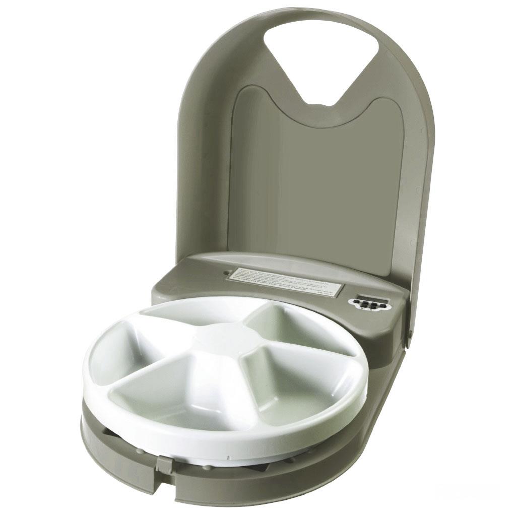 Der Katzenfutterautomat »Plus« Futterautomat Katze hat eine Größe von 5x230g und 5 Schalen. Je Schale 230g Trockenfutter, 24/7 Programmautomatik, batteriebetrieben (4 x 1,5v D Zellen) nicht enthalten.