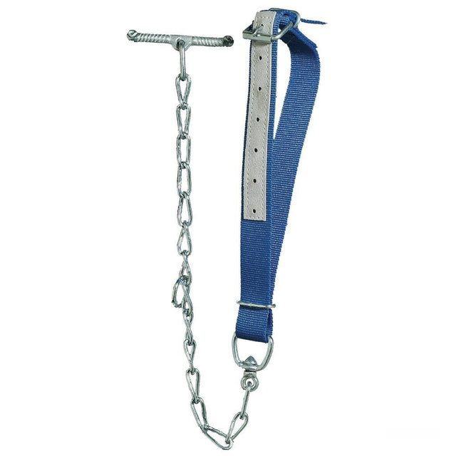 Das Kälberhalsband »Teen« zur Anbindung mit Kette hat einen lederverstärkten Treviragurt und eine Kette mit Knebel.