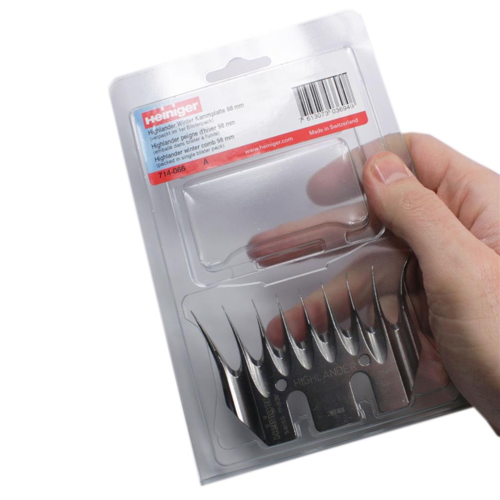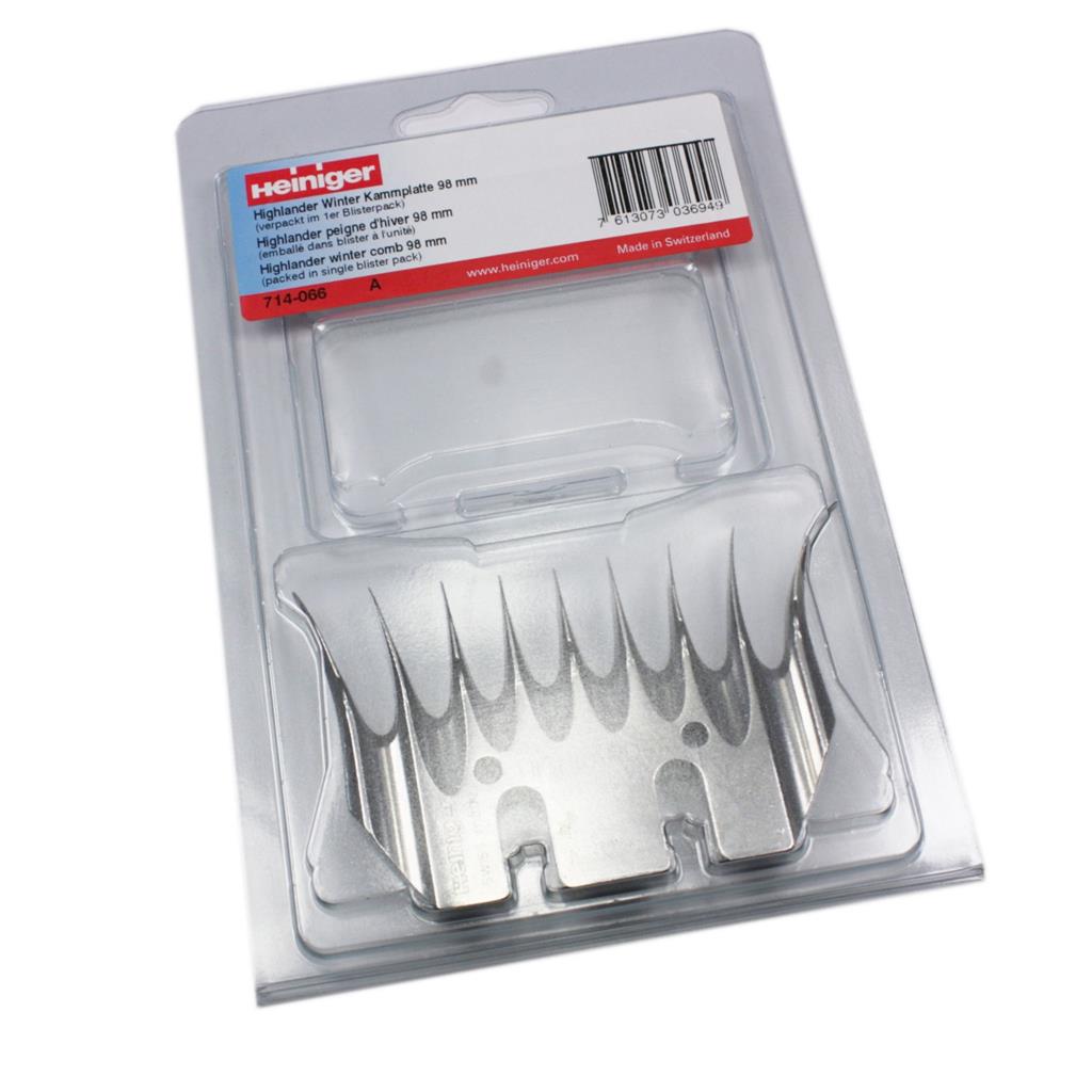 Heiniger Highlander Winter 714-066 Scherkamm 98mm. Für PROFI WinterScherer produzierte Heiniger Schermesser. Scherkamm für die Winterschur. Dieser Kamm ist mit der neusten LG2 Technologie ausgestattet. Hohe Ausbeute in offener Wolle und Schafe mit fester Wolle. Die aus Spezialstahl gefertigten Schermesser haben eine lange Haltbarkeit. Nachschliff ist mit diesen Schermessern deshalb mehrmals möglich.