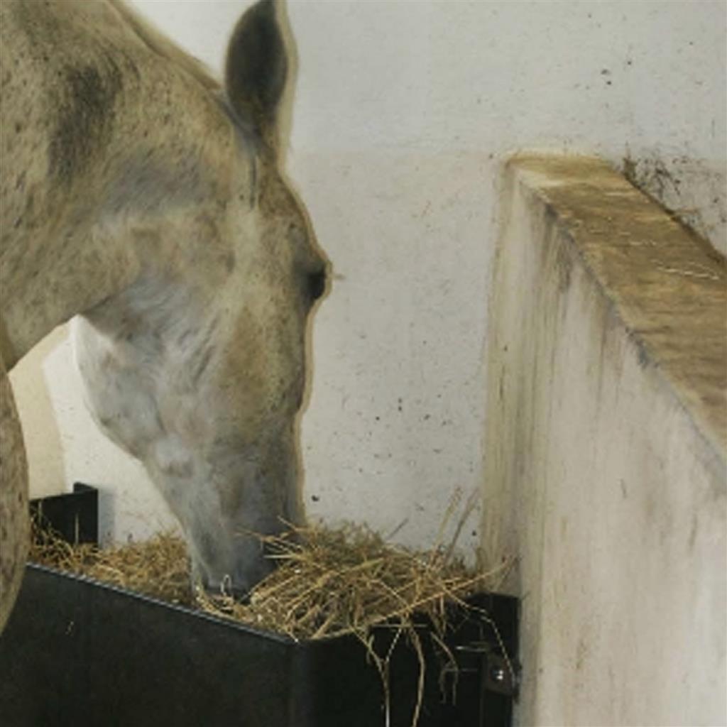Durch die Montage in der Ecke schafft sich der Heuspender selbst ein großes Fassungsvolumen. Das Heu liegt immer luftig und überflüssiges Wasser kann ablaufen. Die Pferde schleudern weniger Futter in die Box was zu geringerem Futterverlust und einer effizienteren Futternutzung führt. Die Box bleibt zudem länger sauber.