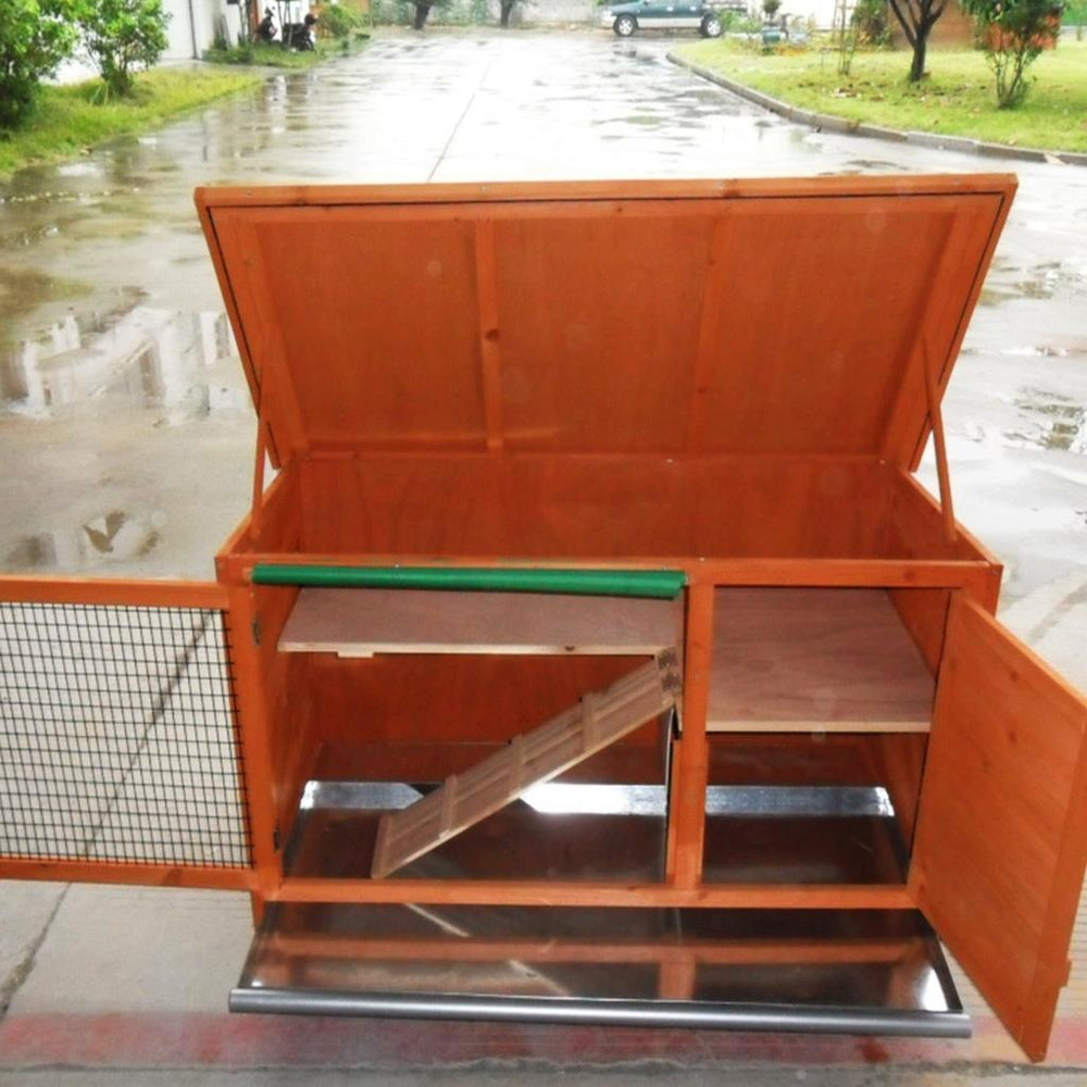 Der Kaninchenstall "Jumbo" ist zwei-etagig und mit Ruhezohne ausgestattet. Über eine Holztreppe mit Querstegen können die Kleintiere von unten nach oben laufen und haben dadurch im Stall mehr Freiheit. Unter dem Nagerstall ist eine Wanne angebracht, mit der sich der Stall einfach reinigen lässt: einfach herausziehen und entleeren. Durch die Gittertüre sehen Sie als Züchter jederzeit was im Kaninchenstall gerade passiert. Das Dach des Kleintier Stalls ist mit Bitumen-Dachpappe belegt und damit dicht gegenüber der Wetter, Wind und Witterung. Die Größe des Kaninchenstalls ist mit 120x61x74cm ideal für professionelle Einsteiger in die Karnickelzucht, aber auch für Profizüchter die einen großen Ruhestall für Aufzucht, Trennung oder ähnliches benötigen. Der Profi Kaninchenstall wird im einfach aufzubauenden Bausatz geliefert.