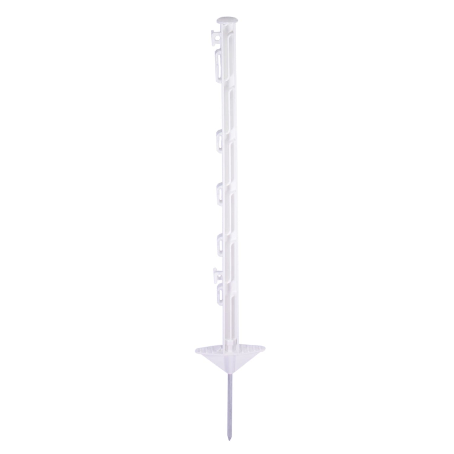 Die Weidezaunpfähle »Dreieckstritt« 10x, Kunststoffpfahl sind weiß und 75cm lang (5 Band- und 2 Seil-Ösen). Durch die Länge von 0,75m eignen sich diese Doppeltritt Wildabwehrpfähle exzellent zur Abwehr von Wild wie Dachse, Otter, Füchse, Kitze, Hasen, Marder und andere Wildtiere. Der Wildabwehr Kunststoffpfahl mit Dreieckdoppeltritt ermöglicht festen und sicheren Stand auch auf unebenen Böden.