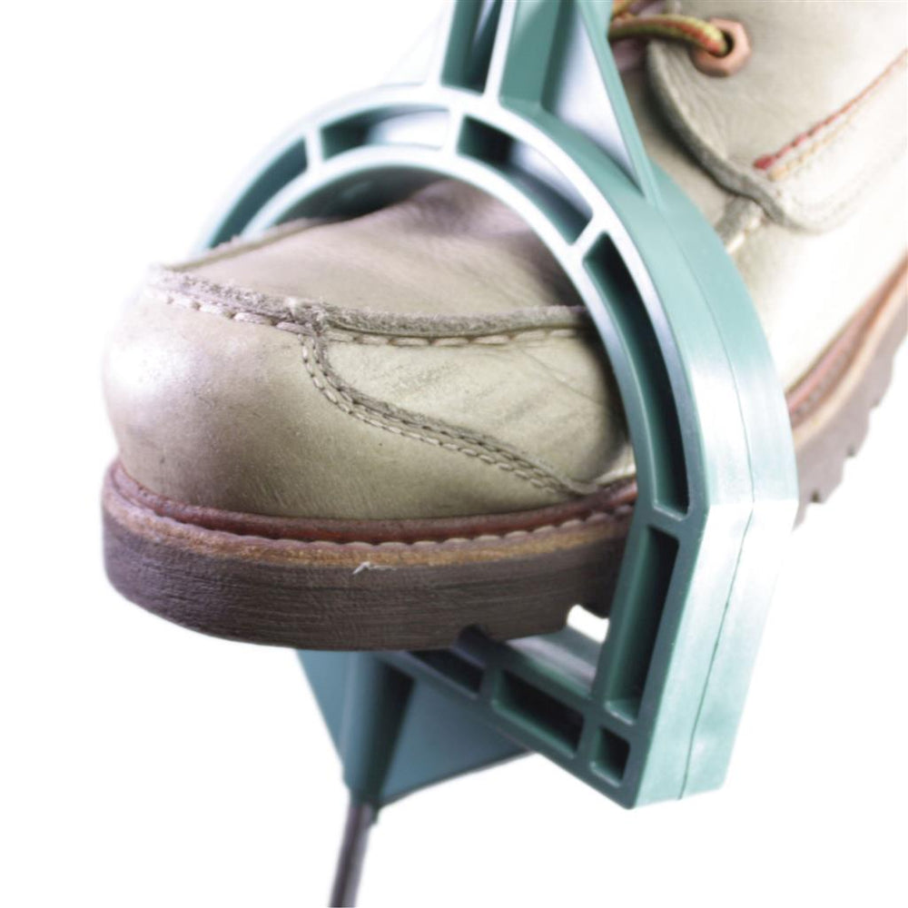 Mit dem Steigbügel lässt sich der Weidezaunpfahl einfach und trittsicher an Ihrem Weidezaun eintreten. Ein eingespritzter verzinkter 8mm Stahlnagel am Fußende der Weidezaunpfähle und dessen verwindungsfreihes Profil sorgen für festen Stand. Die beiden Trittstege links und rechts über dem Stahlnagel verteilen die auf den Weidezaunpfahl wirkenden Kräfte in weichen und harten Böden. Die insgesamt 16 Ösen entlang der Weidezaunpfähle mit Steigbügeltritt verteilen sich auf 4 schmale Weidezaunband-Ösen unten, 4 breitere Weidezaunband-Ösen und 8 Ösen für Weidezaunseil jeweils oben am Weidezaunpfahl. Schließlich macht die grüne Farbe die Steigbügelpfähle zum angenehm dezenter Blickfang an Ihrem Weidezaun.