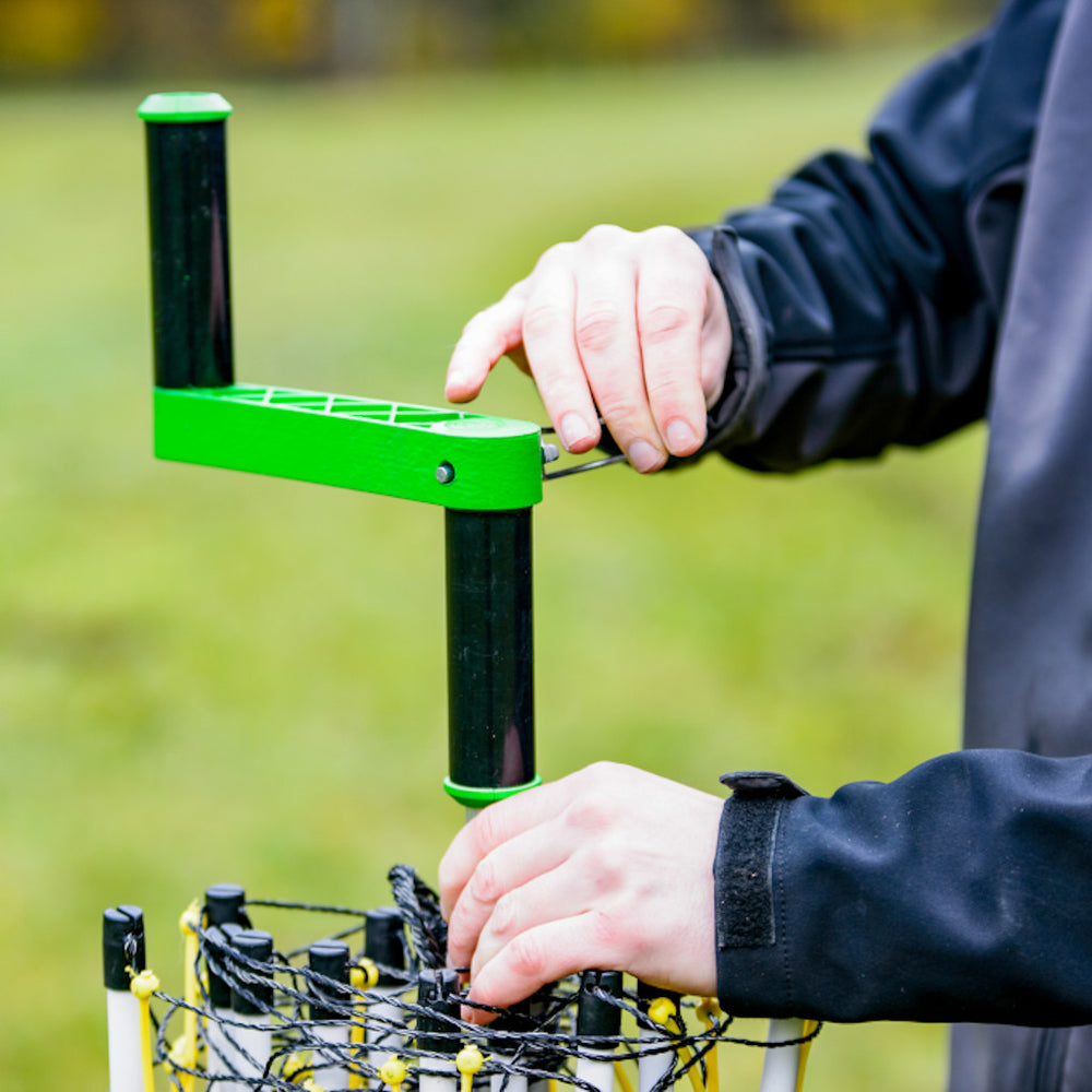 Der Twist Butler ermöglicht das einfache auf- bzw. abrollen von Weidenetzen bis zu einer Höhe von 125cm - einfacher denn je und das im Handumdrehen! Zuerst die Spitze des Pfahls auf das Aufbewahrungselement stellen und anschließend das Netz in wenigen Schritten Stück für Stück aufrollen. Dies erspart Zeit und ermöglicht ein praktisches lagern direkt auf dem Aufbewahrungselement. Die Aufbewahrungselemente können beliebig oft dazu erworben werden. Sollte der Zaun wieder aufgebaut werden, wird er einfach vom Twist Butler abgerollt ohne ein lästiges Entwirren vom Netz. Ebenfalls werden keine weiteren Personen mehr zu auf- bzw. abrollen benötigt. Die dazugehörige, haspelähnliche Kurbel kann in zwei Schritten demontiert werden und ist somit sofort für ein weiteres Aufbewahrungselement universell einsatzbereit.