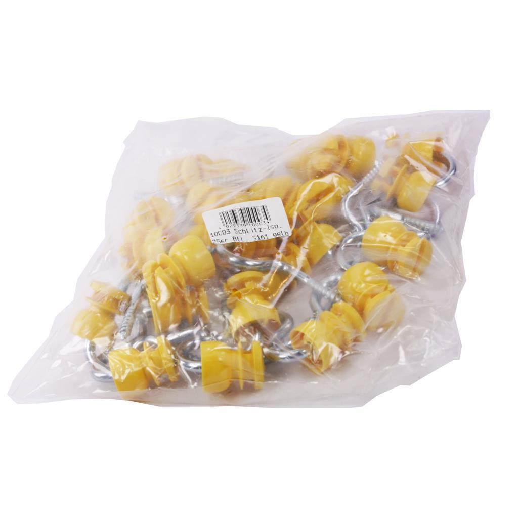 Die Schlitzisolatoren »S151« 25x, für Weide mit 13cm Langstiel sind gelb. Mit gefrästem Holzgewinde - somit leichter einzudrehen, aus eigener Produktion, fast unzerbrechlich, wetterfest, für Litzen, Drähte und Bänder. Schlitzisolatoren aus Polyethylen, mit verz. Eisenstütze 6mm x 13cm, auch für Bänder bis 10mm, Beutel à 25 Stück