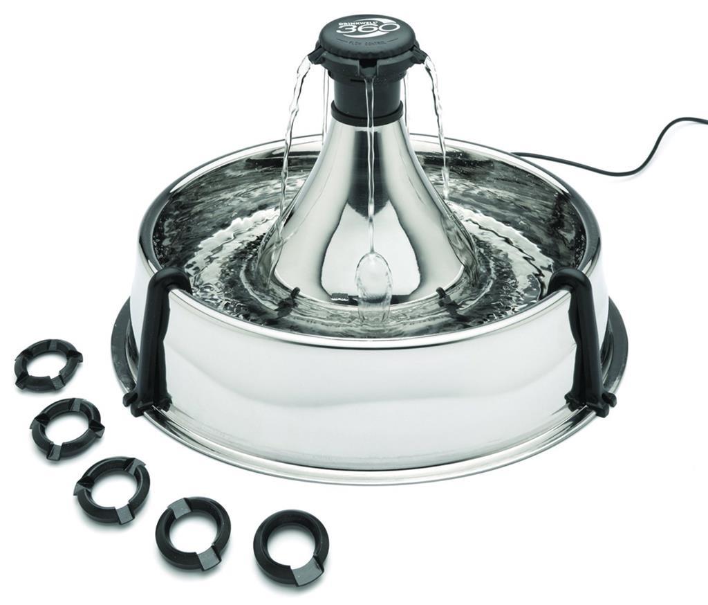 Wasserstrahl in fünf individuellen Varianten durch austauschbare Ausgussringe Austauschbarer Aktivkohlefilter beseitigt schlechten Geschmack und Gerüche Austauschbarer Schaumfilter hält die Pumpe durch das Abfangen von Haaren und Fremdkörpern sauberer Wasserrutsche verhindert Spritzer und Wassergeräusche Tauchpumpe für einen leisen Betrieb Spülmaschinenfest (mit Ausnahme der Pumpe) Warum fließendes Wasser so wichtig für eine verbesserte Gesundheit von Haustieren ist... In der Natur ist fließendes Wasser viel frischer als stehendes Wasser. Die Bewegung bricht permanent die Oberflächenspannung des Wassers und befördert Sauerstoff aus der Luft in das Wasser. Dieser Prozess wird als Sauerstoffanreicherung bezeichnet und das Wasser ist dadurch angenehmer zu trinken. Haustiere bevorzugen möglicherweise aus diesem Grund instinktiv fließendes Wasser. Forschungsergebnisse zeigen, dass eine der besten Methoden, die Gesundheit Ihres Haustiers zu verbessern, darin besteht, ihnen mehr Wasser zu trinken zu geben, und am besten funktioniert dies mit dem Drinkwell® 360 Edelstahl -Trinkbrunnen. Der Trinkbrunnen filtert fließendes Wasser kontinuierlich, reichert es mit Sauerstoff an und sorgt für mehr Frische als bei stehendem Wasser in einer Schüssel. Der konstante Wasserkreislauf verhindert auch das Bakterienwachstum zwischen den Reinigungen und hält den Trinkbrunnen sauberer. Durch den Drinkwell® 360 Edelstahl - Trinkbrunnen wird das Bedürfnis von Haustieren nach frischem, fließendem Wasser befriedigt und dies gibt dem Haustierbesitzer, der sein Tier kennt, Sicherheit, dass sein Haustier mit frischem Wasser versorgt ist. Trinkbrunnen animieren Haustiere dazu, mehr zu trinken und werden deshalb von Tierärzten empfohlen.