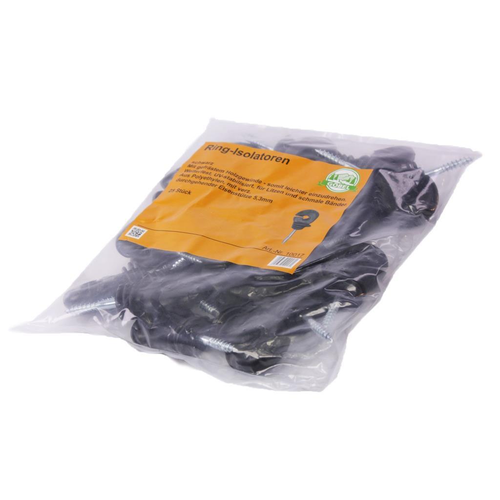 Die Ringisolatoren »S461R« 25x, für Litze, Band sind schwarz. Mit gefrästem Holzgewinde - somit leichter einzudrehen. Wetterfest, UV-stabilisiert, für Litzen und schmale Bänder. Die Ringisolatoren sind aus Polyethylen und mit verz. durchgehender Eisenstütze 5,3mm (hierbei geht die Stütze bis in den Kopf des Isolators durch: kein Abbrechen möglich). Beutel à 25 Stück