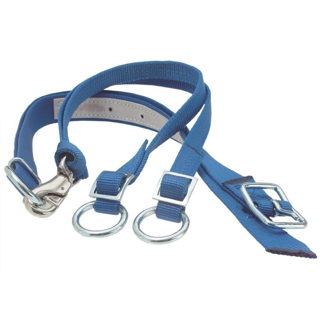 Die Anbindung »Trevira« Hals- und Bodenriemen aus blauem Gurt mit D- Ring und Karabinerhaken haben keine Stromleitfähigkeit. Hautschonend, leichtes Öffnen durch Rollschnalle, formbeständiger extra lederverstärkter Halsriemen für Kühe, Rinder und Jungtiere.