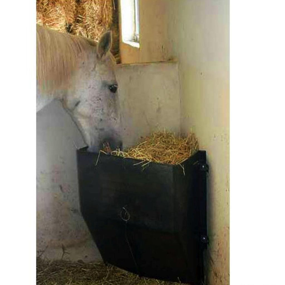 Durch die Montage in der Ecke schafft sich der Heuspender selbst ein großes Fassungsvolumen. Das Heu liegt immer luftig und überflüssiges Wasser kann ablaufen. Die Pferde schleudern weniger Futter in die Box was zu geringerem Futterverlust und einer effizienteren Futternutzung führt. Die Box bleibt zudem länger sauber.