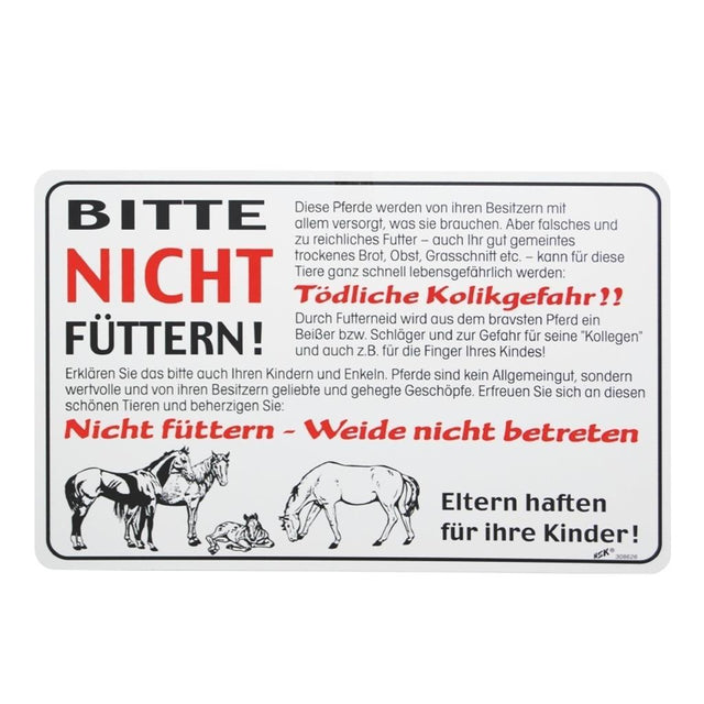 Das Hinweisschild »Pferdeweide« Kunststoff Schild hat eine Größe von 30x20cm und ist aus Kunststoff. Weißes Hinweisschild für Pferde mit rot/schwarzem Druck.